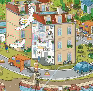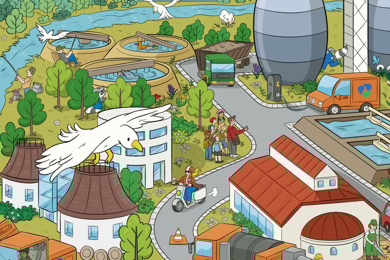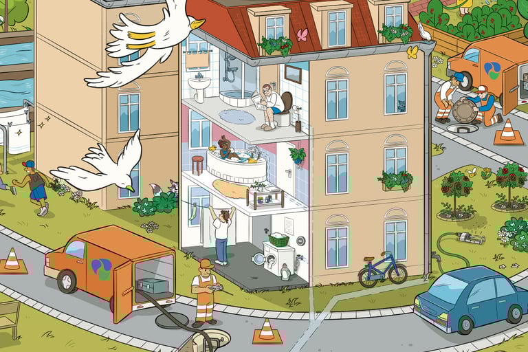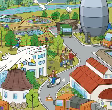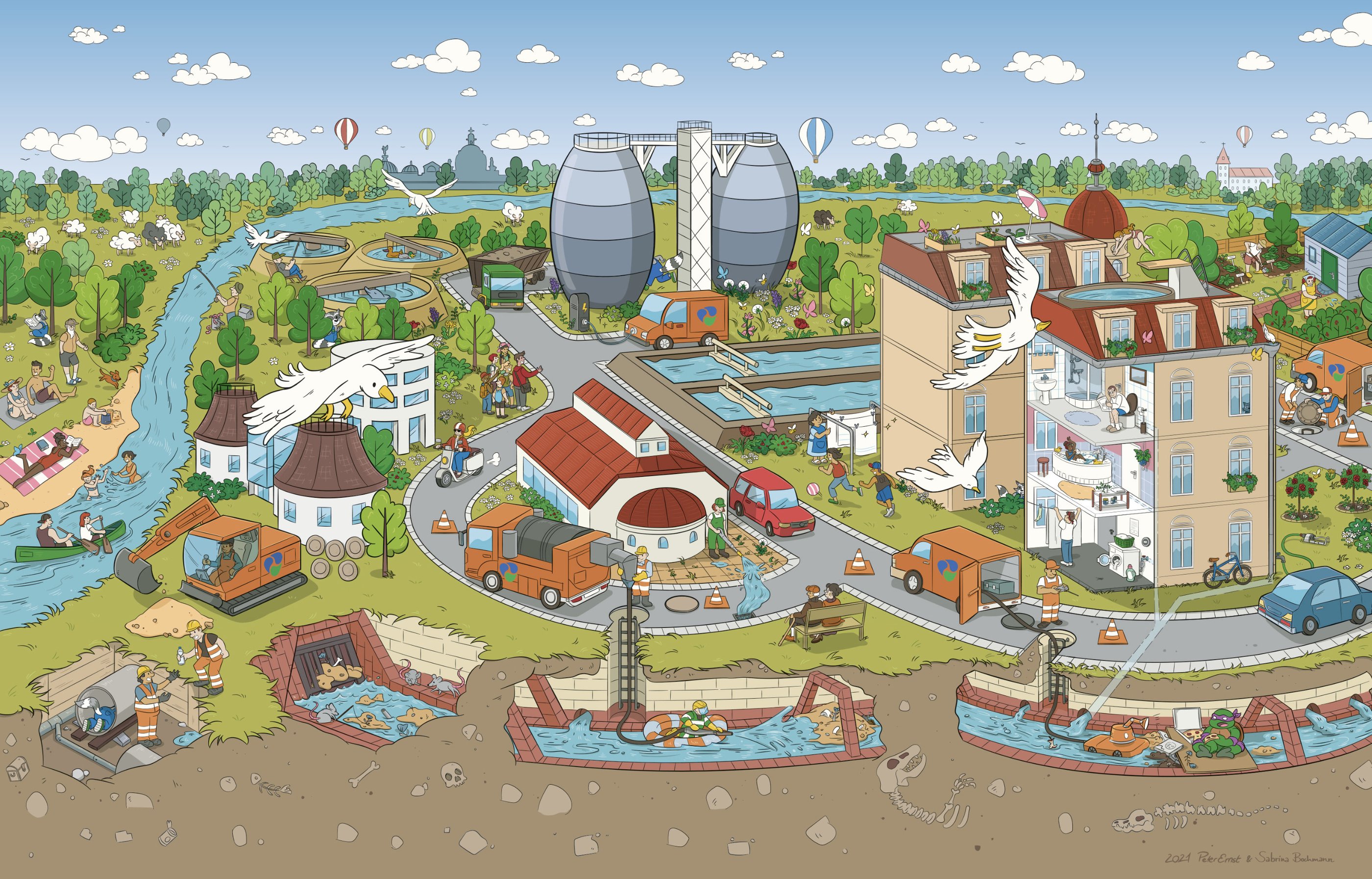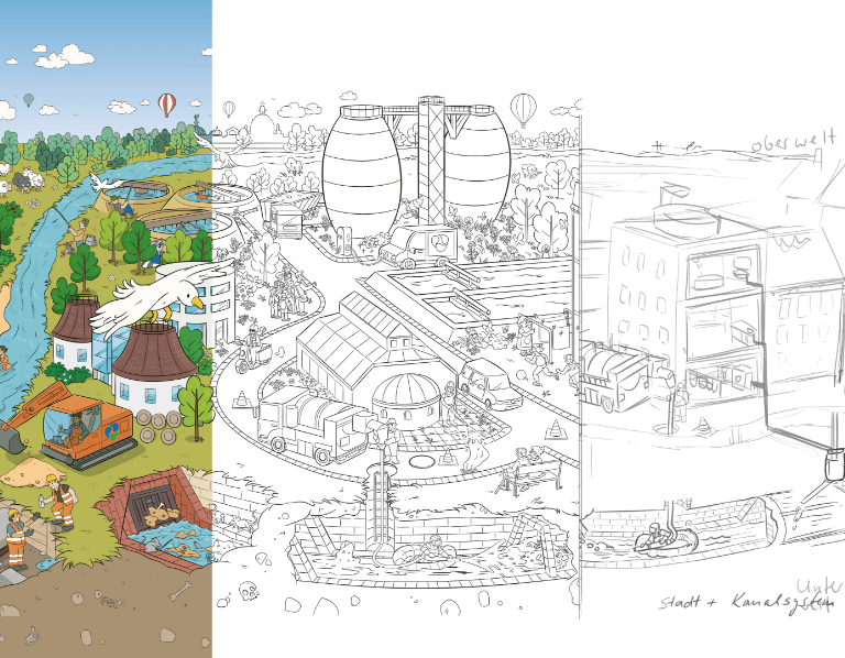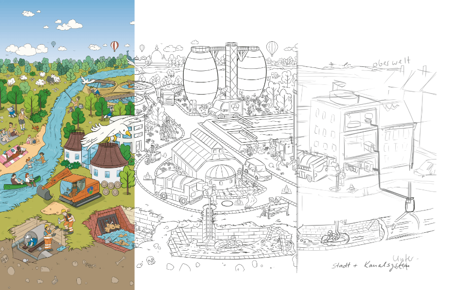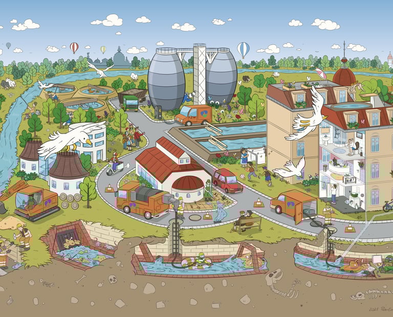 In Zusammenarbeit mit dem Illustrator Peter Ernst entstand ein buntes Wimmelbild, das die technischen Stufen der Wasseraufbereitung in Dresden zeigt. Das Bild soll u.a. für Schulklassen und Besichtigungen im Haus verwendet werden. Für großformatige Drucke, beispielsweise Plakate und Banner, wurde die Zeichnung als Vektor-Grafik angelegt.